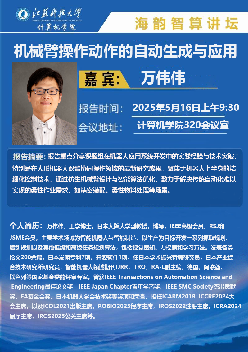 海韵智算讲坛:(万伟伟)机械臂操作动作的自动生成与...