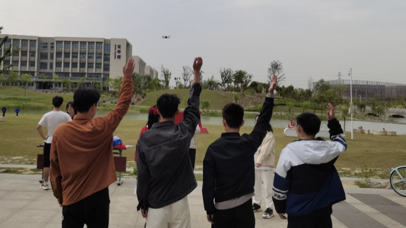 图书馆辅楼处,同学们手持细绳,齐心协力跳起了欢快的大绳舞,场面欢声笑语。