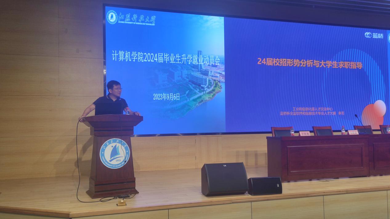 为推进毕业生高质量升学就业,帮助毕业生厘清就业形势,明确就业规划与目标,9月6日,计算机学院召开了“2024届毕业生升学就业动员会”及集体主题班会,全体院领导、毕业班班主任和2024届毕业生出席会议,会议由党委副书记吴健康主持。