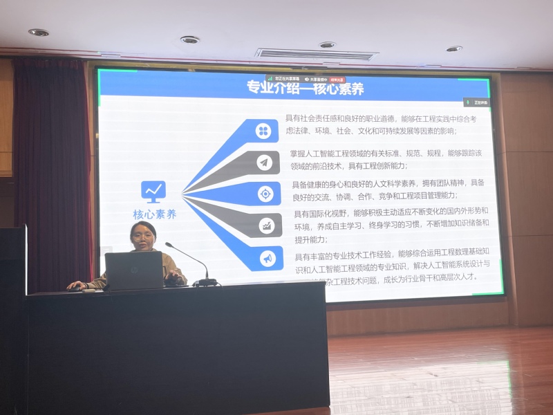 首先,邓星老师为大家带来了一场详尽且生动的人工智能专业的介绍。邓老师凭借自身丰富的教学经验和突出的学术功底,开篇便从人工智能发展历程切入,专业地解答了同学们心中“人工智能是什么?”这一疑惑。接着又系统且全面地阐述了专业特色优势、未来发展与行业前景、学院在专业方面取得的高质量成果以及就业与升学的建议。她深入剖析了专业培养方案,详细介绍了培养目标、课程设置、知识框架、毕业要求等,为新生构建了一幅清晰的知识体系蓝图。