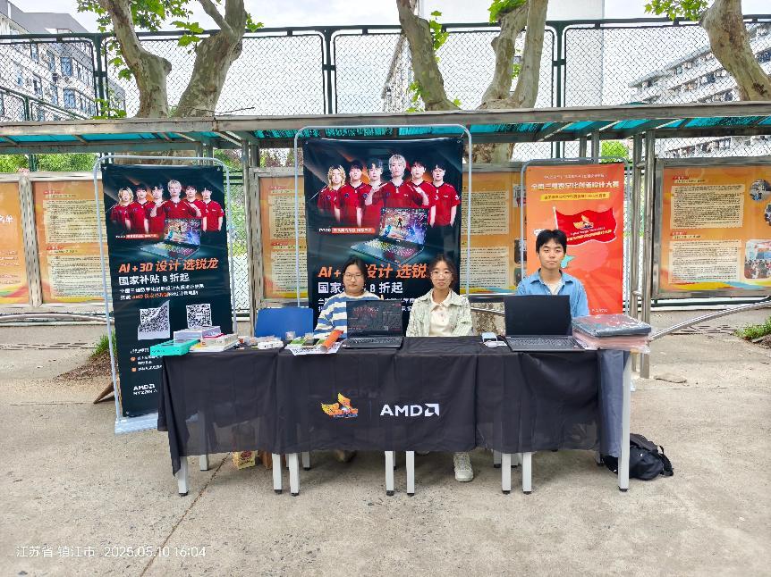 活动现场,精心布置的宣传展板成为一道亮丽的风景线。“AI + 3D设计 选锐龙”的主题醒目突出,展示了技术与设计深度融合的魅力。展板上,搭载AMD锐龙处理器的设计师电脑吸引了众多目光,其强大的性能仿佛在向同学们招手,助力他们在3D设计的世界里尽情驰骋。