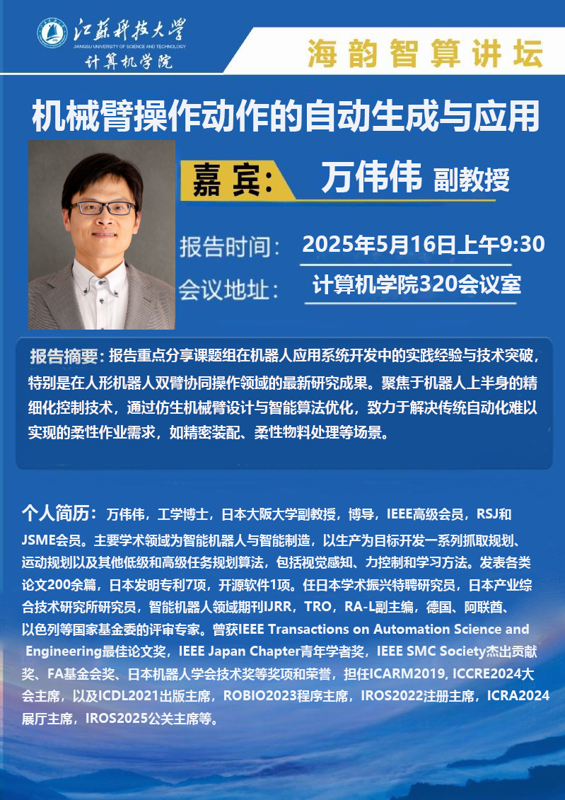 海韵智算讲坛:(万伟伟)机械臂操作动作的自动生成与应用